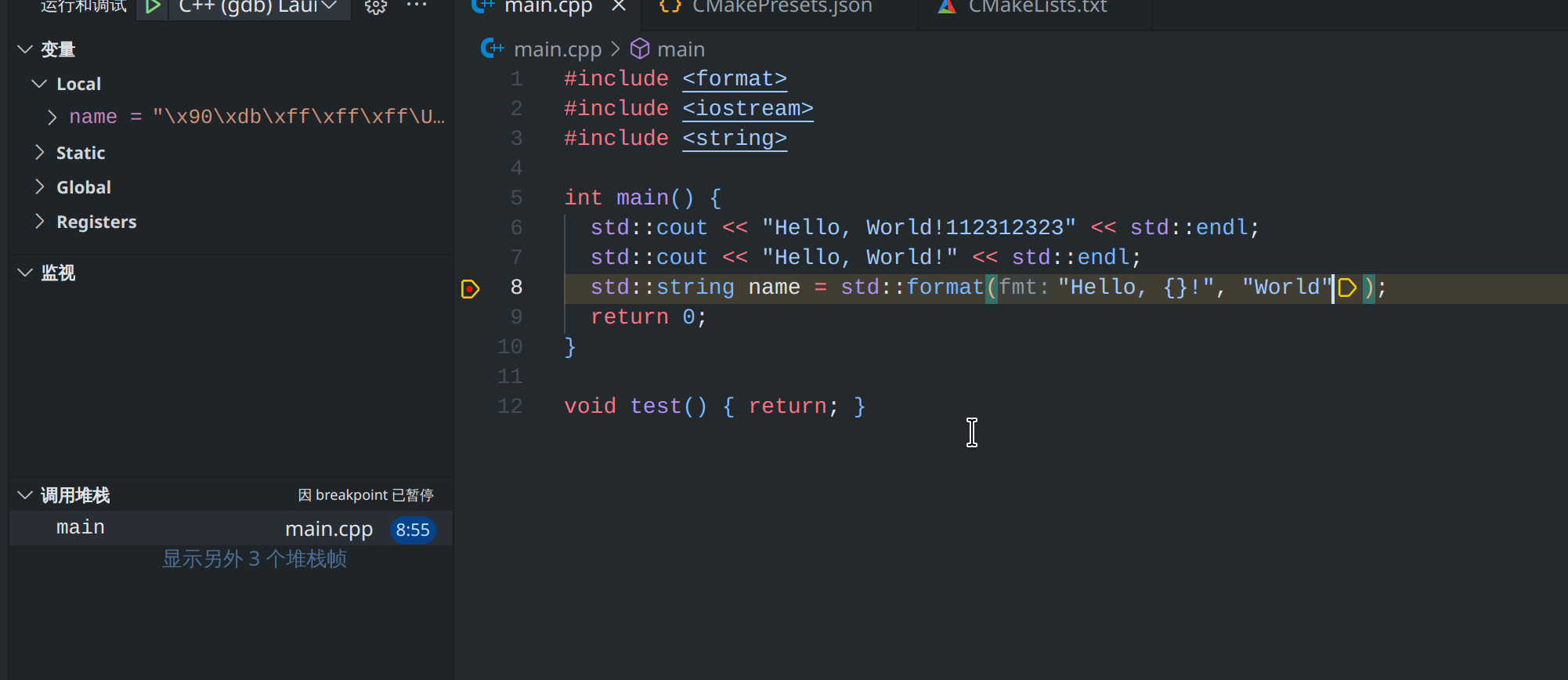 { "launch": { "configurations": [ // 新增的配置 { "name": "C++ (gdb) Launch", "type": "lldb", "request": "launch", "program": "${command:cmake.launchTargetPath}", "args": [], "cwd": "${workspaceFolder}", }, // ....... 你的其他设置 ] },}这个配置主要是用来配置VSCode的调试功能,有了这个我们就可以使用F5进行调试。打上断点后F5。
