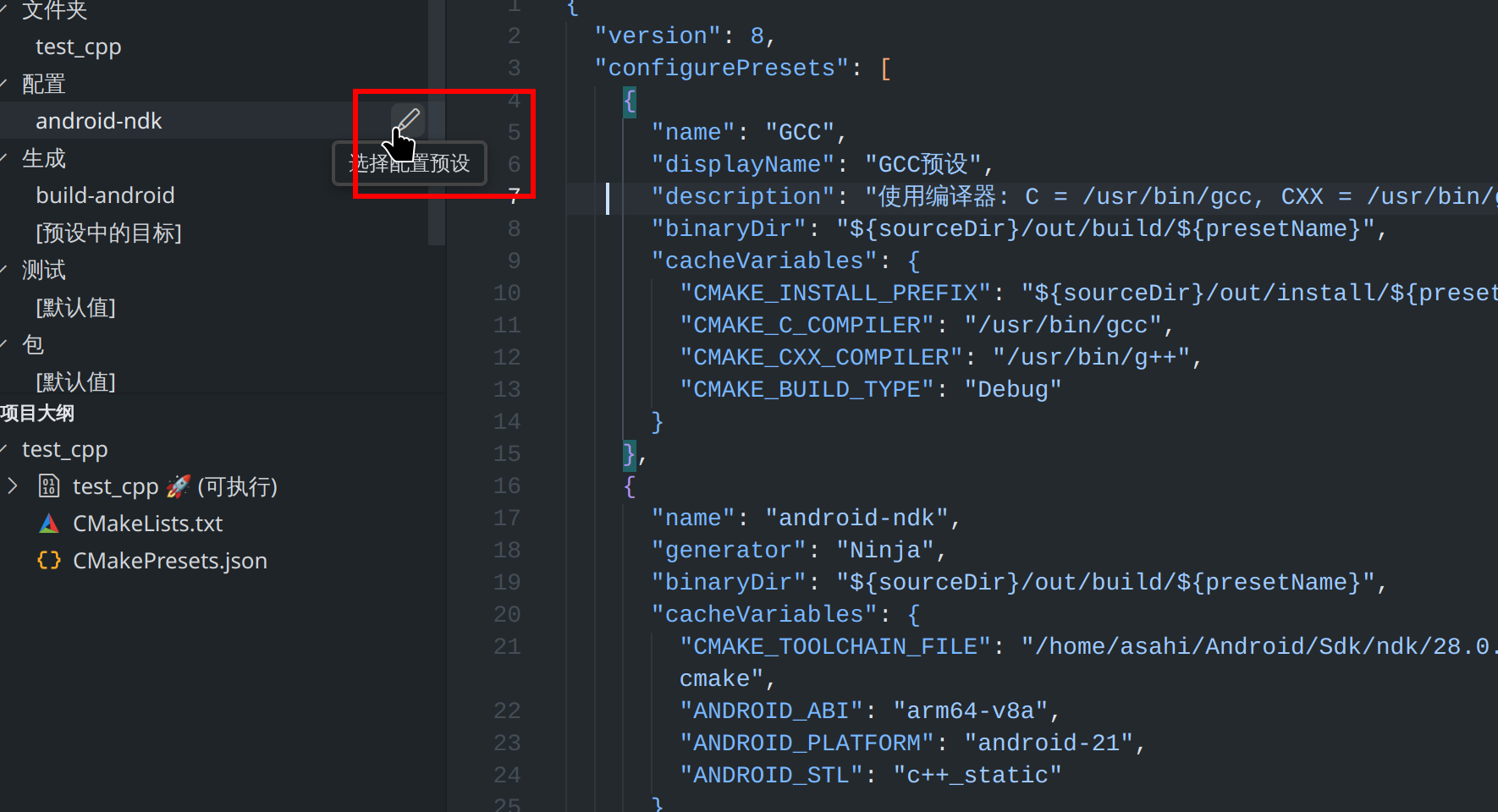 { "version": 8, "configurePresets": [ { "name": "GCC", "displayName": "GCC预设", "description": "使用编译器: C = /usr/bin/gcc, CXX = /usr/bin/g++", "binaryDir": "${sourceDir}/out/build/${presetName}", "cacheVariables": { "CMAKE_INSTALL_PREFIX": "${sourceDir}/out/install/${presetName}", "CMAKE_C_COMPILER": "/usr/bin/gcc", "CMAKE_CXX_COMPILER": "/usr/bin/g++", "CMAKE_BUILD_TYPE": "Debug" } }, { "name": "android-ndk", "generator": "Ninja", "binaryDir": "${sourceDir}/out/build/${presetName}", "cacheVariables": { "CMAKE_TOOLCHAIN_FILE": "/home/asahi/Android/Sdk/ndk/28.0.12433566/build/cmake/android.toolchain.cmake", "ANDROID_ABI": "arm64-v8a", "ANDROID_PLATFORM": "android-21", "ANDROID_STL": "c++_static" } } ], "buildPresets": [ { "name": "build-g++", "configurePreset": "GCC", "jobs": 4 }, { "name": "build-android", "configurePreset": "android-ndk", "jobs": 4 } ]}使用VSCode的CMake插件,在左侧面板中可以切换预设。