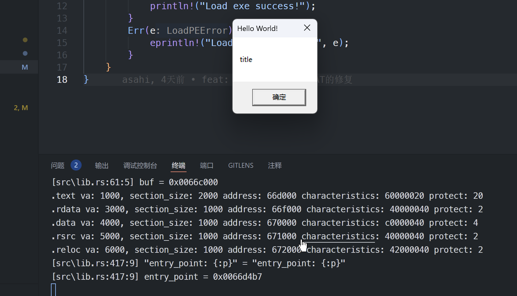 { let entry_point = file .nt_headers() .optional_header .address_of_entry_point .get(LittleEndian); let entry_point = buf as usize + entry_point as usize; let entry_point: extern "system" fn() = unsafe { std::mem::transmute(entry_point) }; dbg!("entry_point: {:p}", entry_point); entry_point();}最后测试